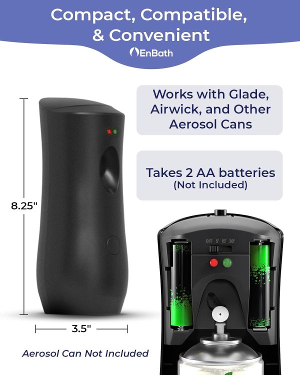 - Fresh and Clean – This automatic scent dispenser keeps rooms smelling great. It uses 2 AA batteries. Compatible with any standard automatic air freshener cans 5.51″x 2.56″ (Aerosol Cans Not Included)