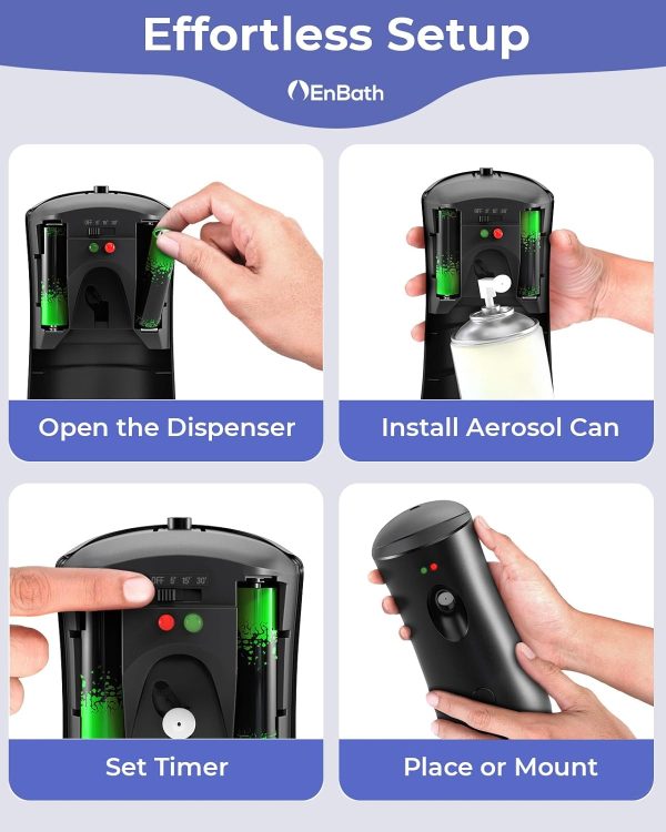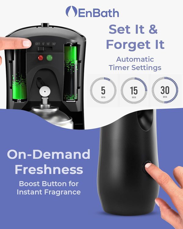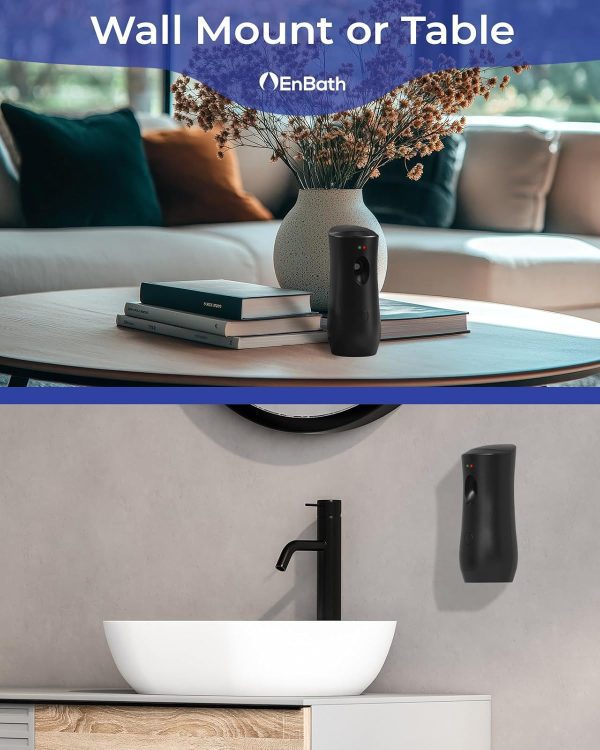 - Wall Mount or Freestanding – A Versatile air freshener dispenser for use in any room. EnBath’s battery powered air freshener can be mounted to the wall or used as a shelf/table top fragrance dispenser